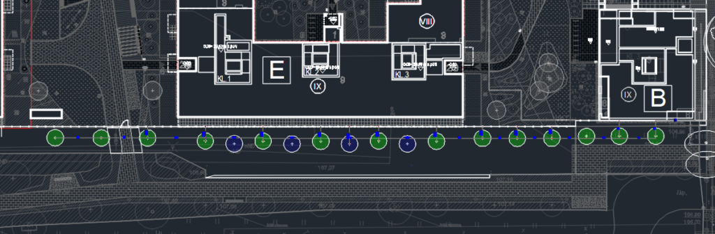 Poniżej wizualizacja nasadzeń (budynek B to Postępu 25, budynek E to Konstruktorska 5D).